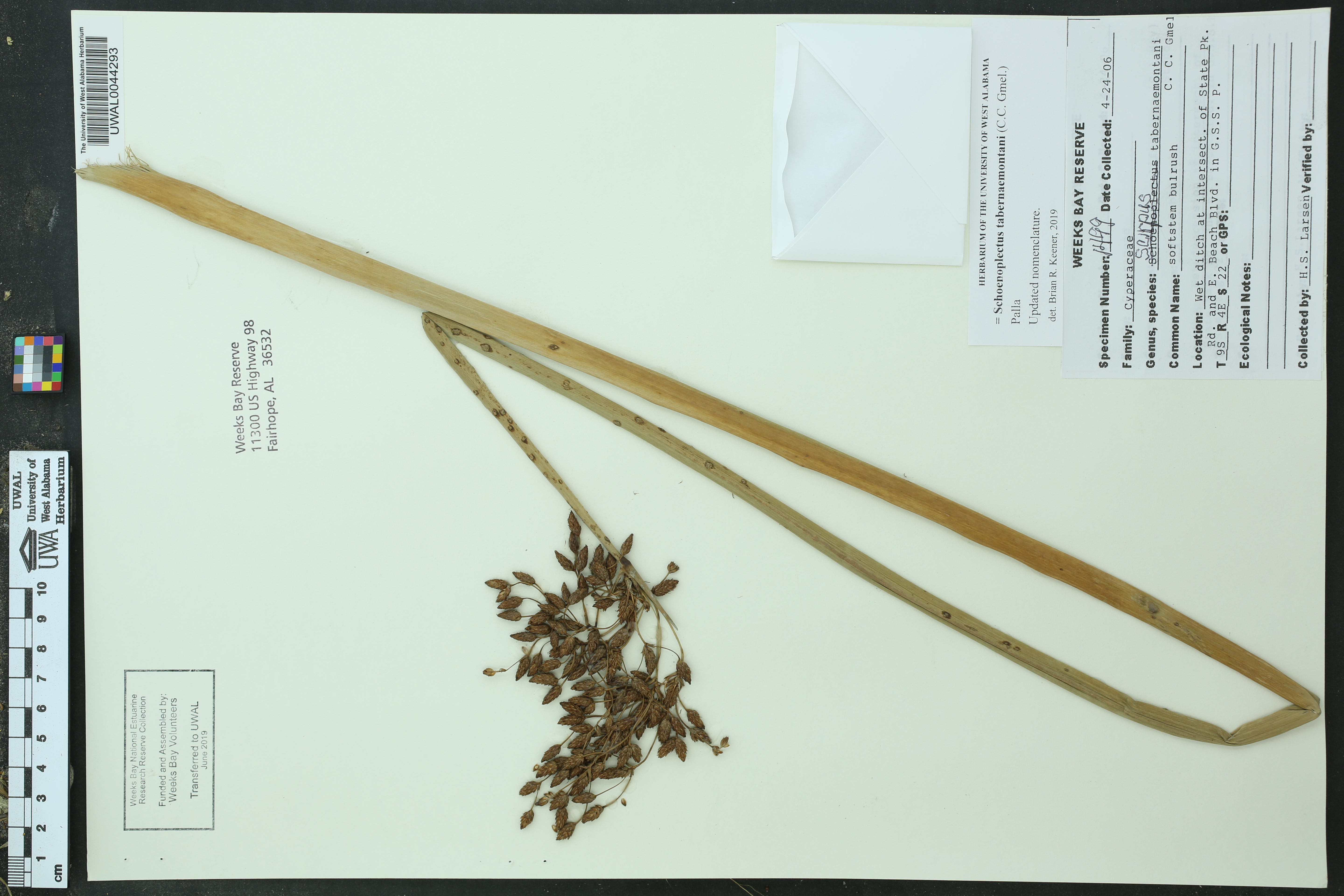 | Scirpus lacustris Linnaeus, subsp. tabernaemontani (C. C. Gmelin) Syme, in Smith & Sowerby, Engl. Bot., ed. 3. 10: 64. 1870. | Scirpus tabernaemontani C. C. Gmelin 1805. | |