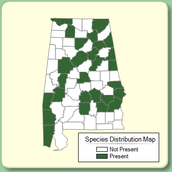 Counties included on distribution map: Barbour, Bullock, Butler, Cherokee, Chilton, Choctaw, Cleburne, Cullman, Etowah, Hale, Jackson, Jefferson, Lauderdale, Lawrence, Lee, Lowndes, Marengo, Marshall, Mobile, Montgomery, Pike, Randolph, Russell, St. Clair, Talladega, Tuscaloosa, Washington