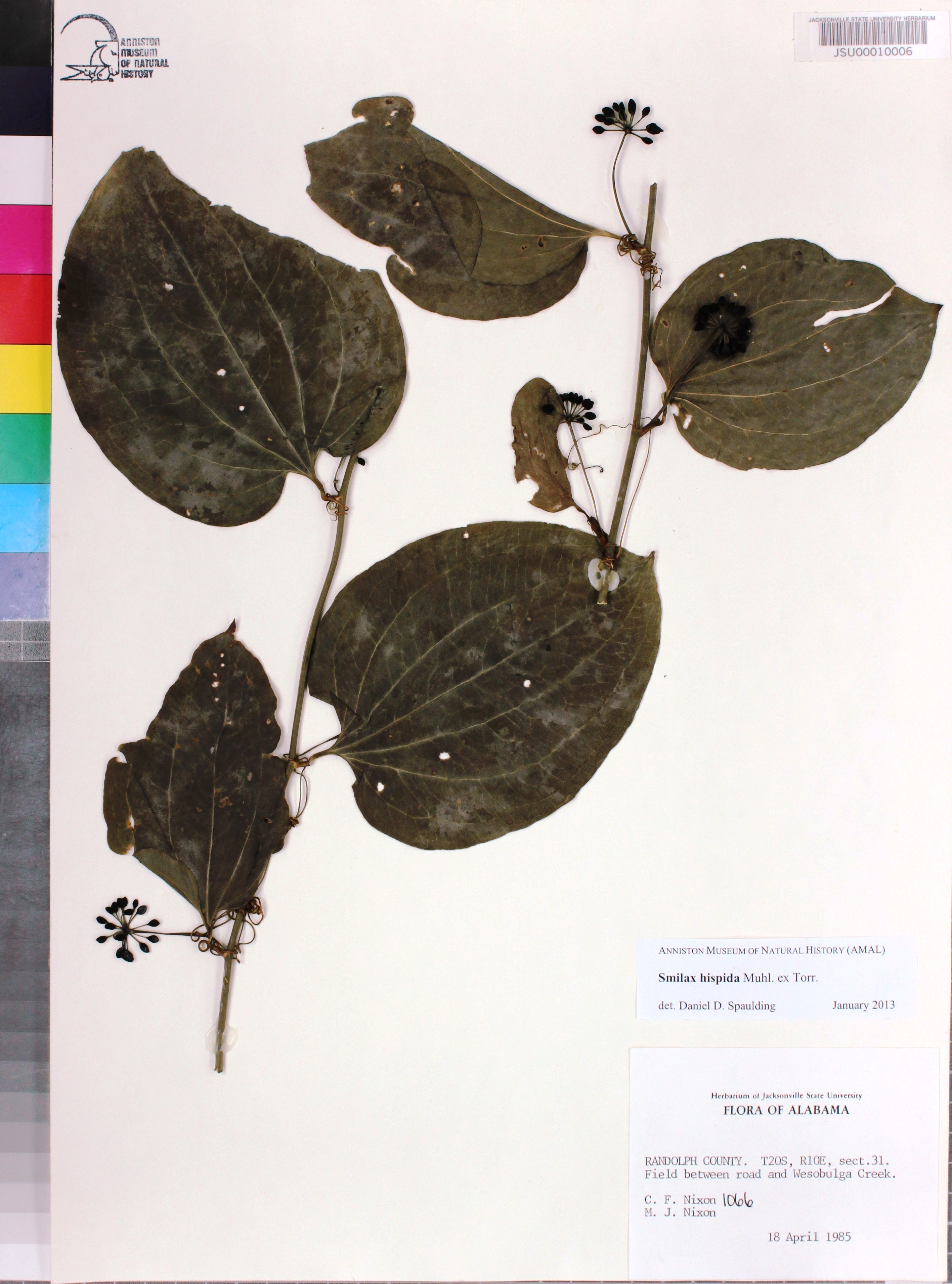 | Currently Accepted Name: | Smilax hispida Muhl. ex Torr. - Determined By: Daniel D. Spaulding, Jan 2013 |